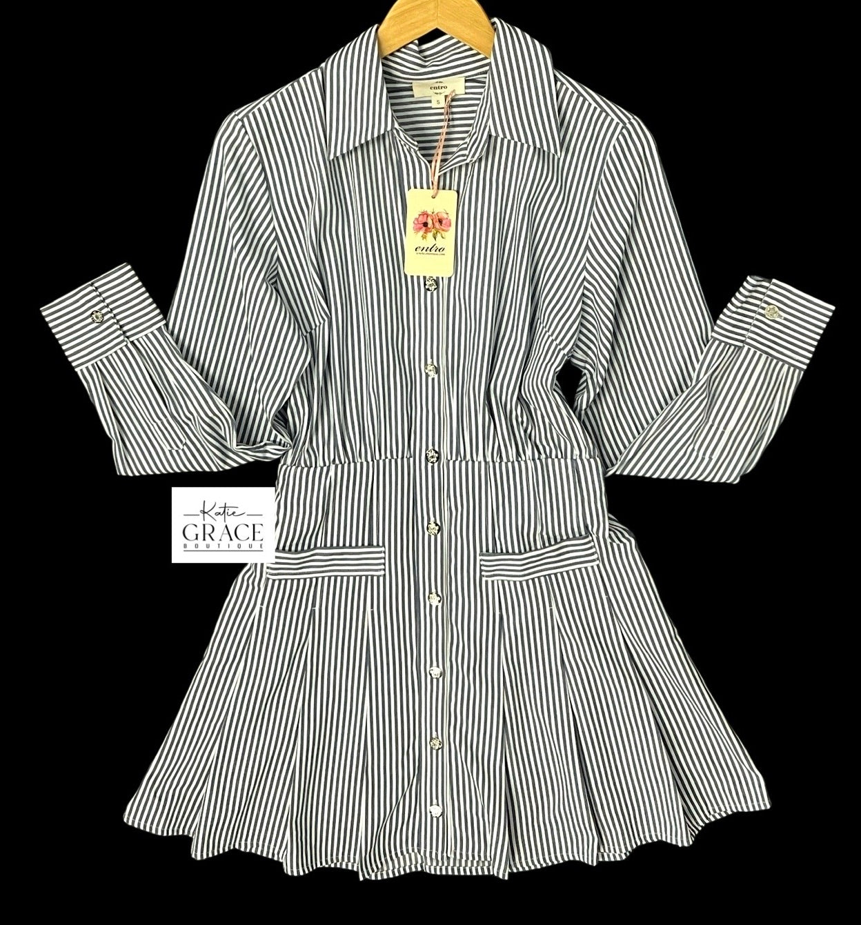Long sleeve, striped dress with pleats in the skirt. Lined with pockets. Available in S-L. Beautiful quality. $48