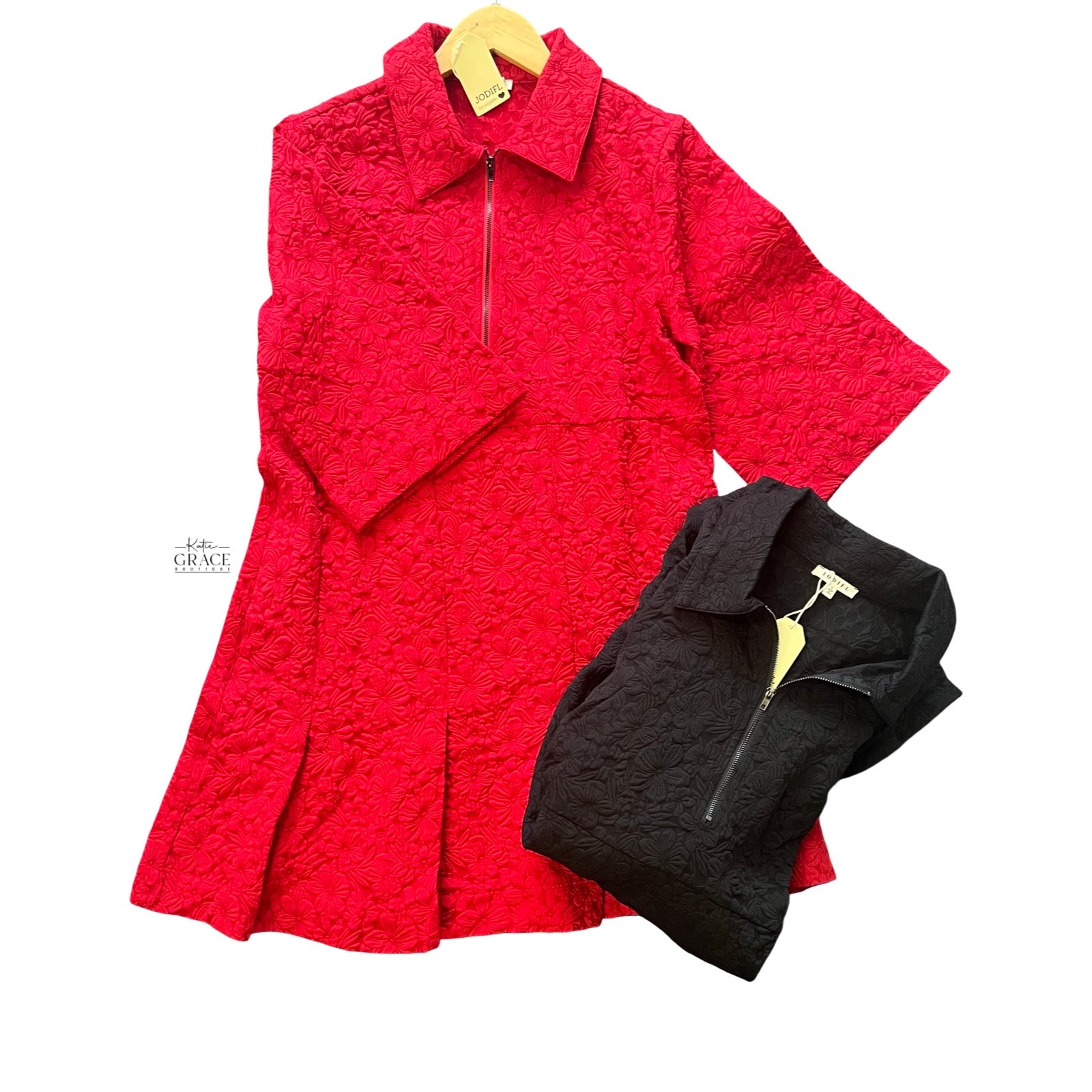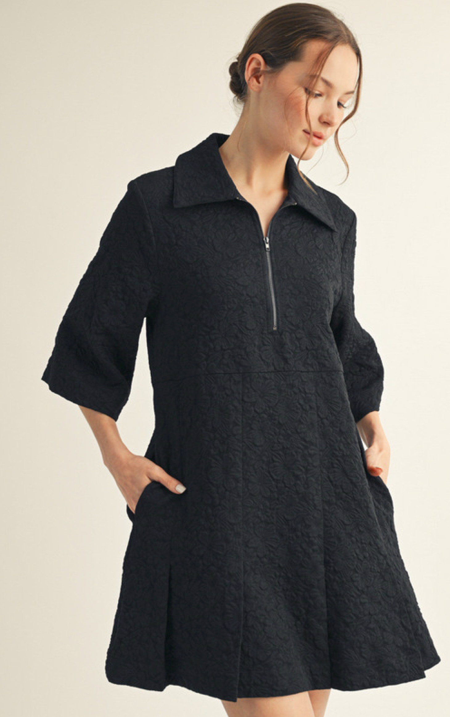 3/4 sleeves floral jacquard dress with side pockets, pleated h38", length 35"em accent, front zip up. S-L. $44