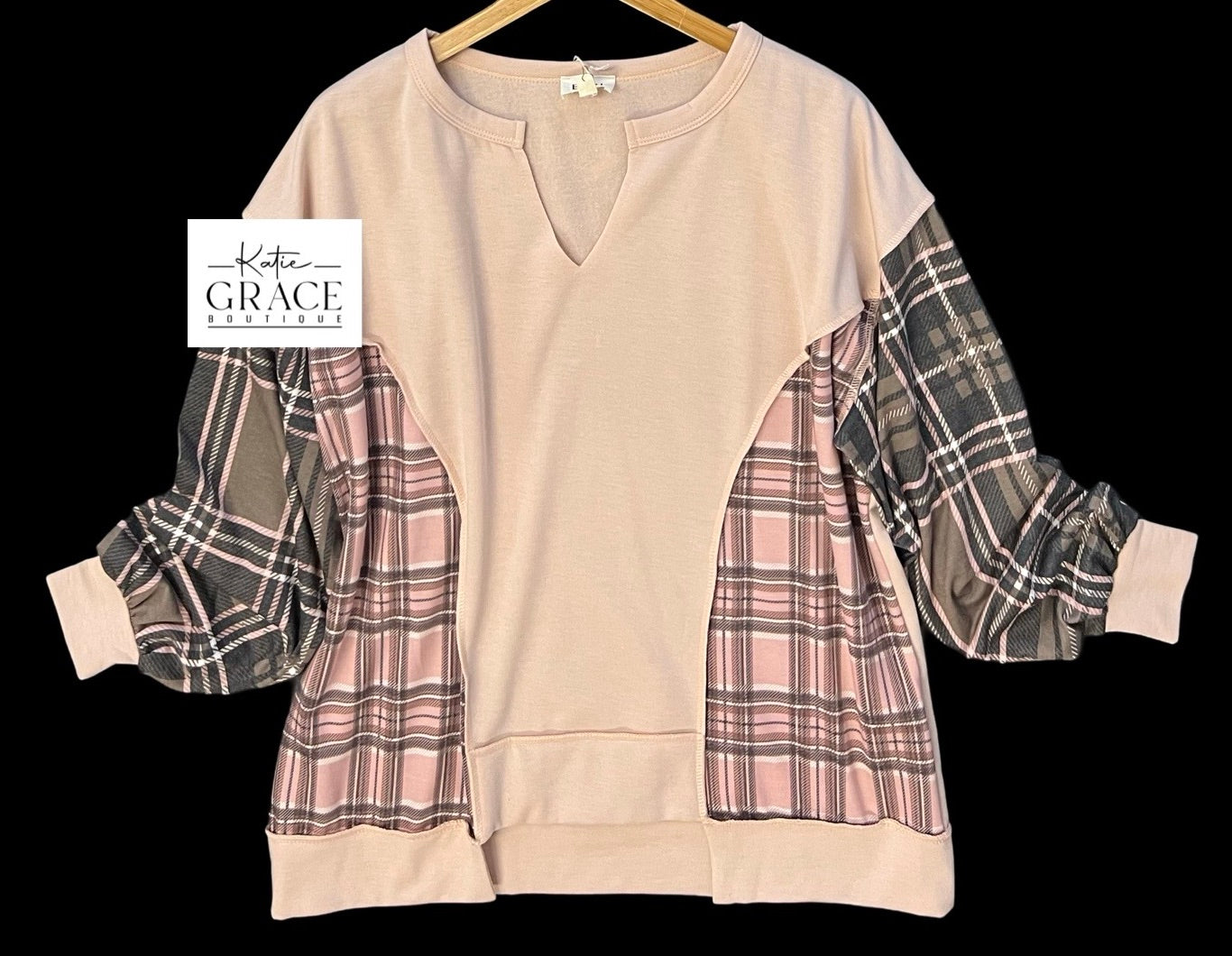 Long sleeve top with plaid insets. Available in S-XL. $39