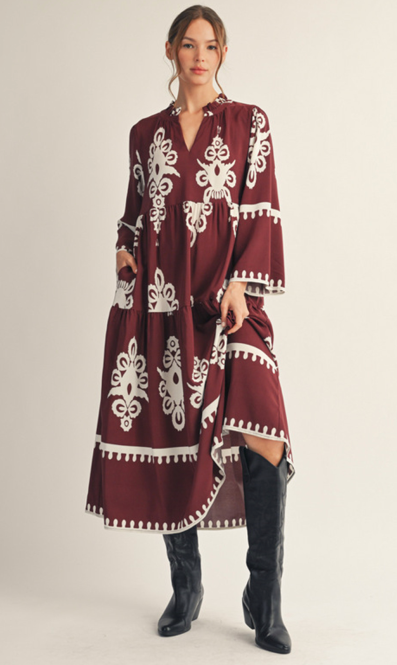 Long sleeves damask border print midi dress with side pockets. Available in S-L. $45