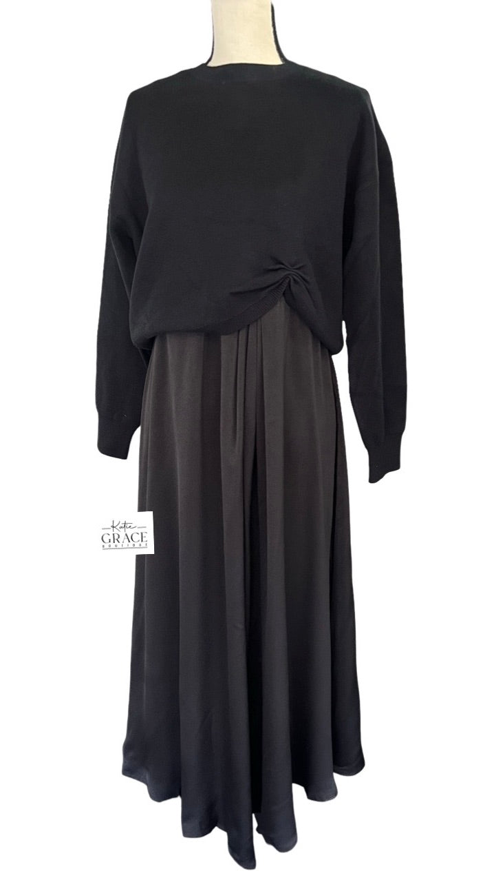 Choose from a midi dress with a satin skirt or a sweater. S-L, Dress $38. Sweater $38.