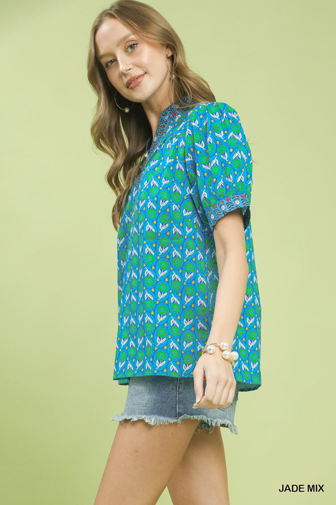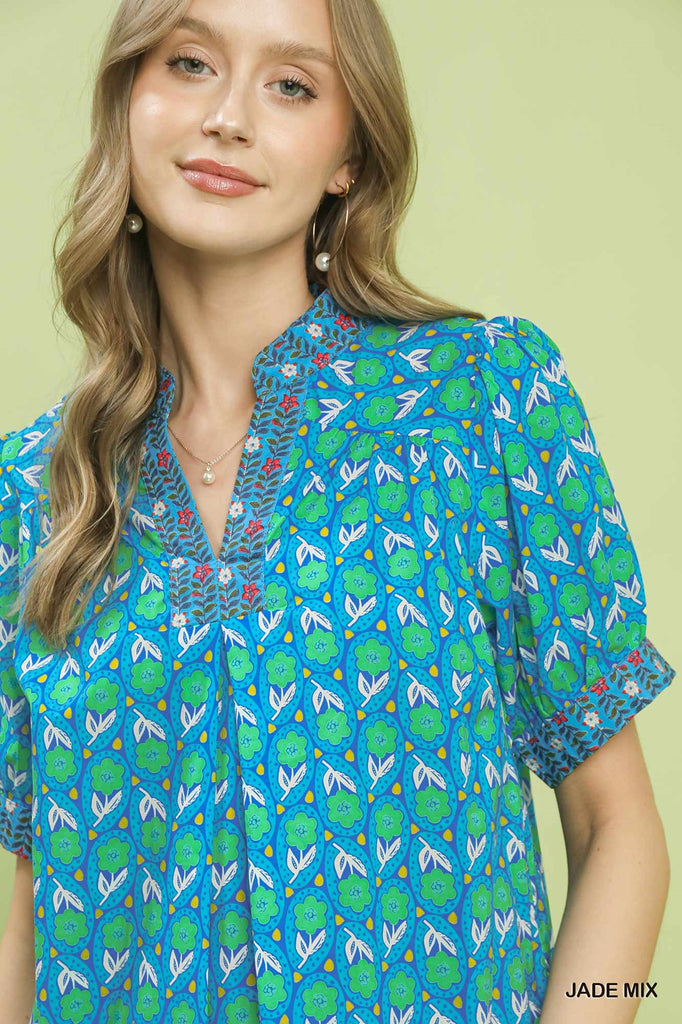 Puff sleeve blouse with v neck and contrast on sleeves. $38
