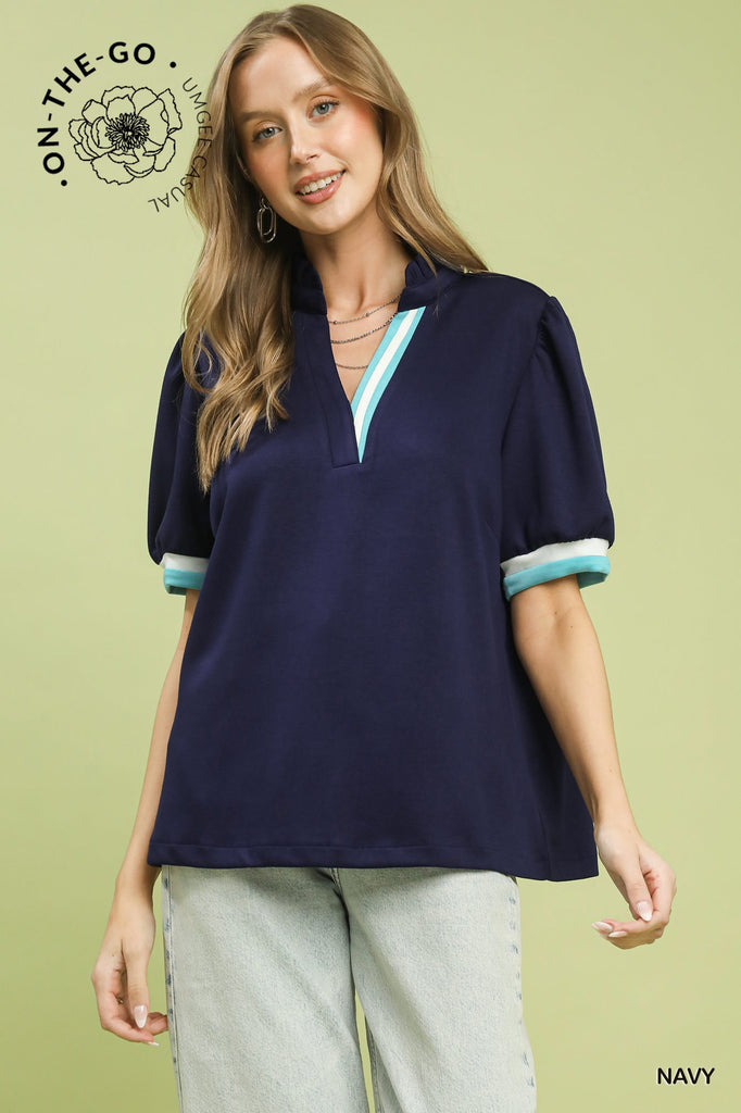 Puff sleeve , with v neck with contrast stripe. Available in S-L. $42