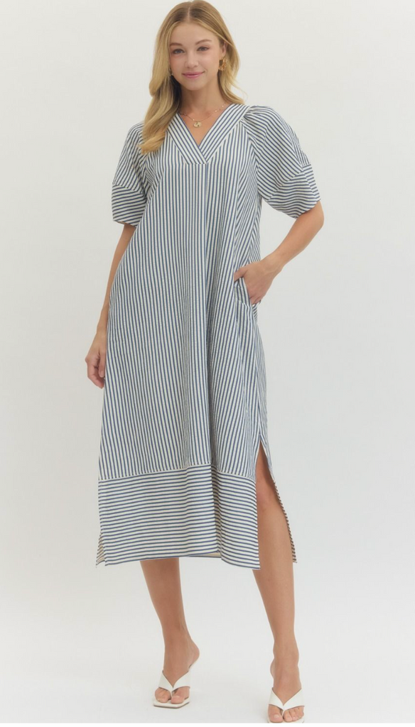 Stripe pattern textured pullover midi dress features  lantern sleeves and slit side hems. Pockets at side. Lined. S-L. $45