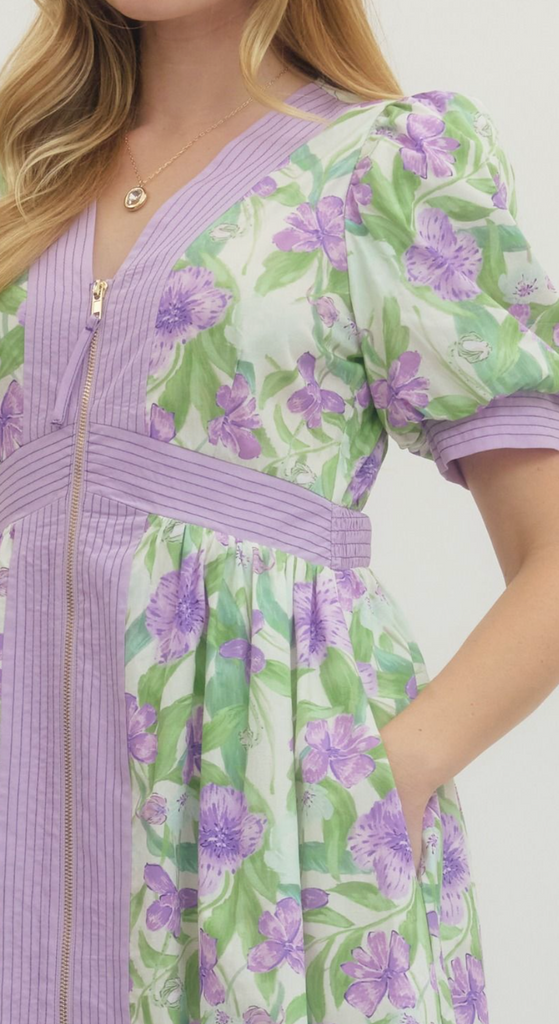 Floral print short puff sleeve midi dress featuring contrast trim and V-neckline. Zip closure at front. Elasticated waistband at back. Lined. S-L. $65