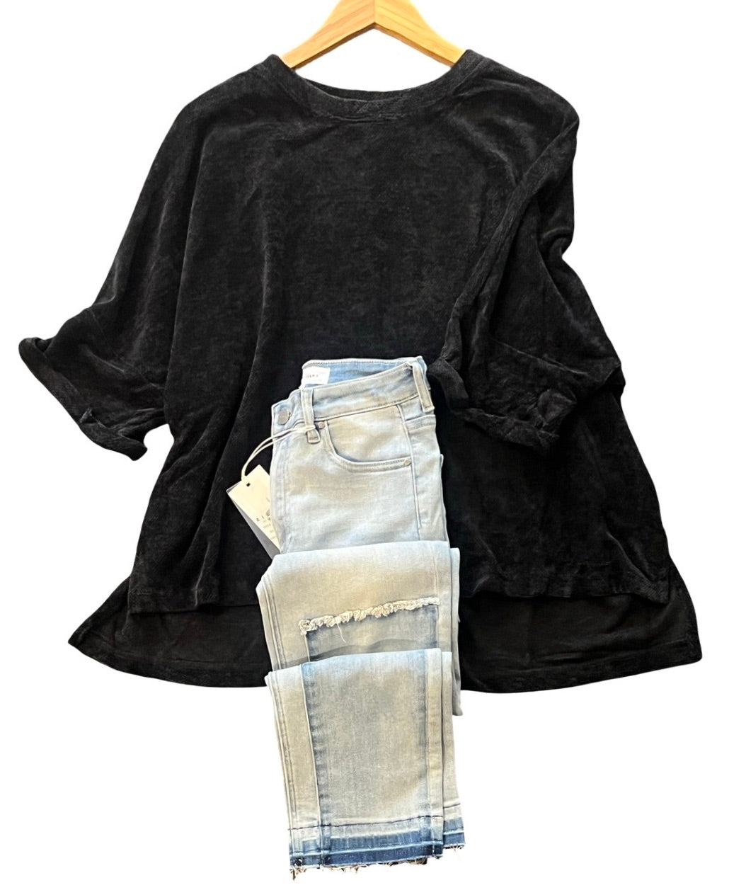 Bust and length measurements are posted for each style for a size M, there is a 2" difference in the bust measurement between sizes. Bust measurements are taken by measuring from armpit to armpit, as it would hang, unstretched. That measurement is then doubled. Length is measured from shoulder seam to hem.