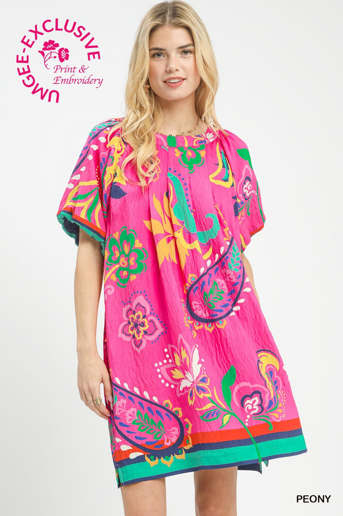 Bold dress multicolor paisley and floral print. Lined with pockets. Available in S-L. $49