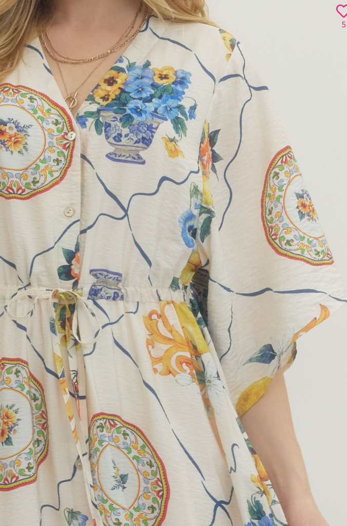 Printed short sleeve maxi dress featuring elasticated waist tie detail. Lined. Button closure at front. S-L. $56