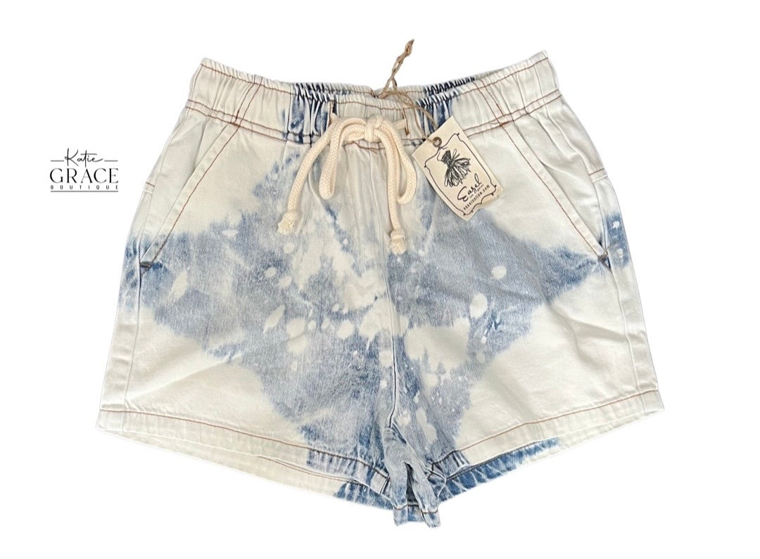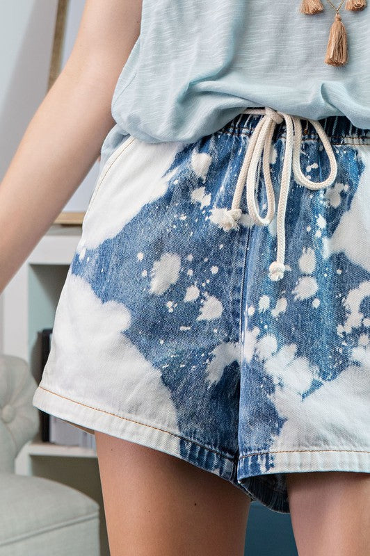 Elastic waist denim shorts. Waist tie and pockets. Available in S-L. $24
