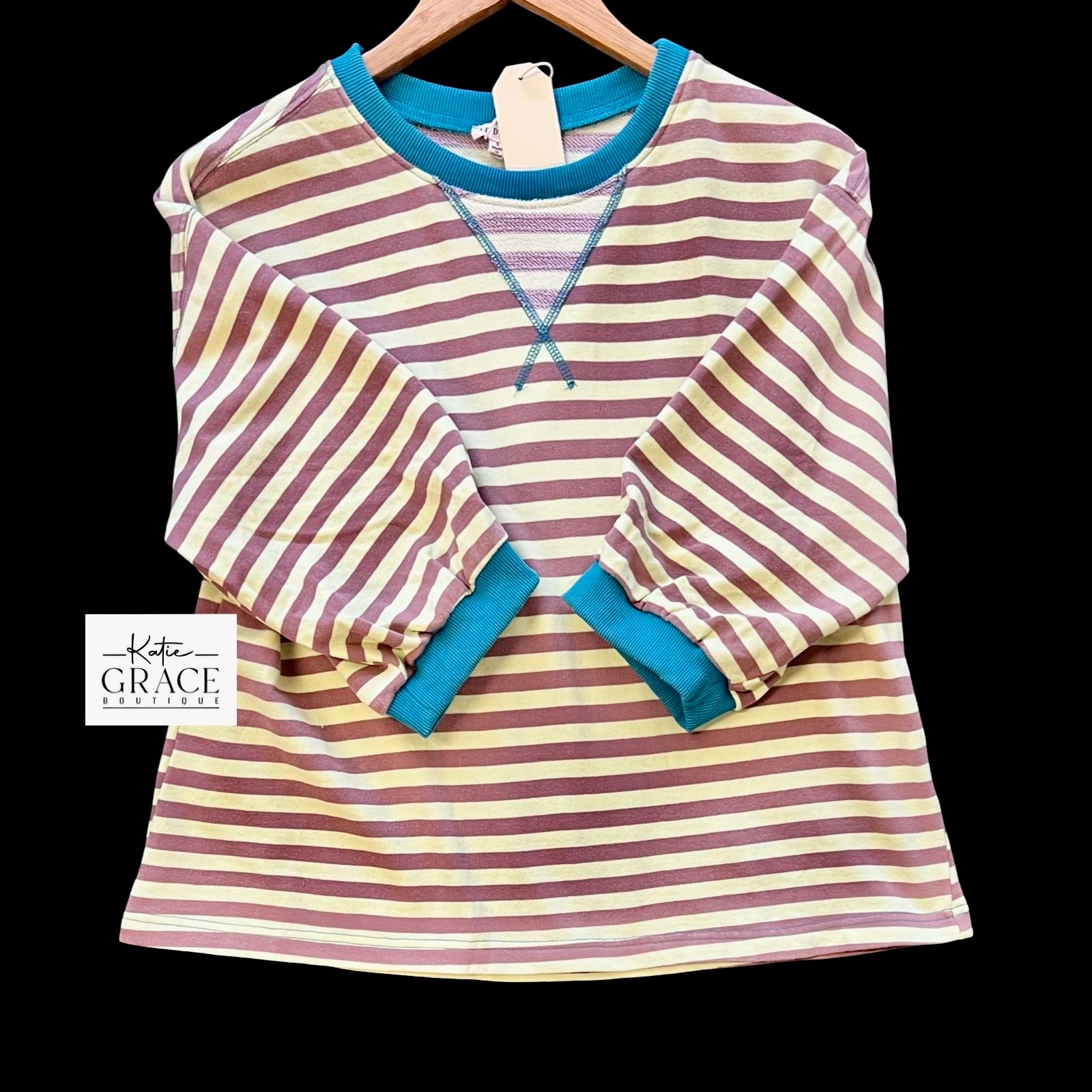 3/4 sleeve striped top. Available in S-L. Yellow and Brown stripe. $36