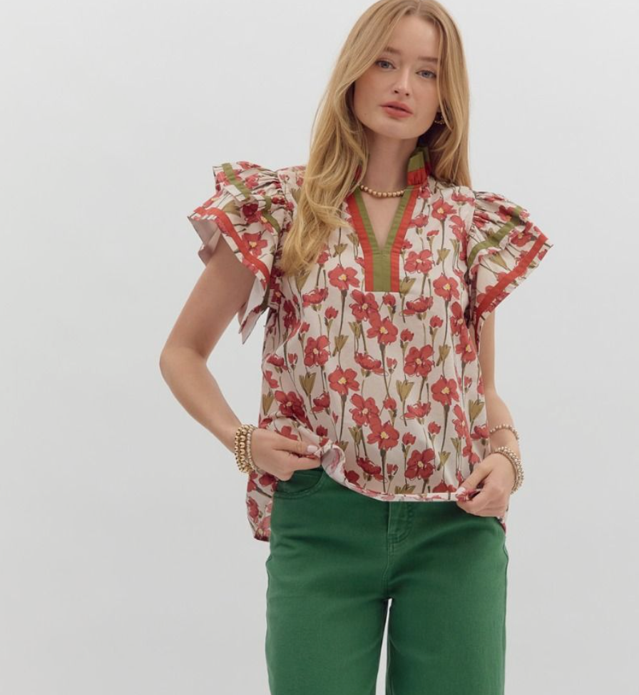 Floral print tiered flutter sleeve pullover top features multicolor accented ruffle neck and sleeve. S-L. $42