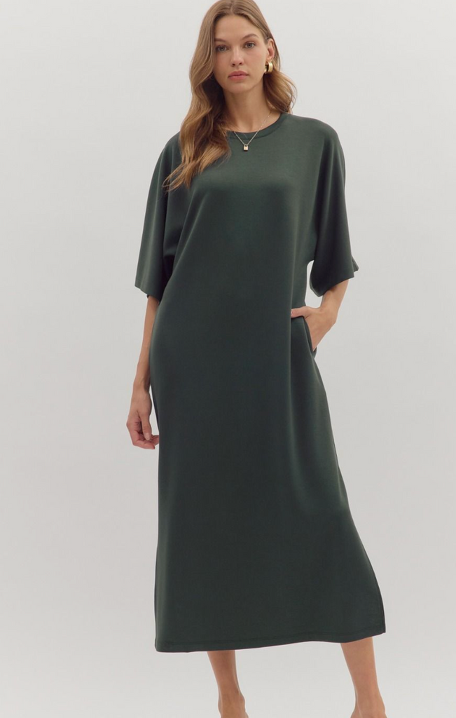 Solid short sleeve midi dress featuring side slits. Side pockets. S-L. $45